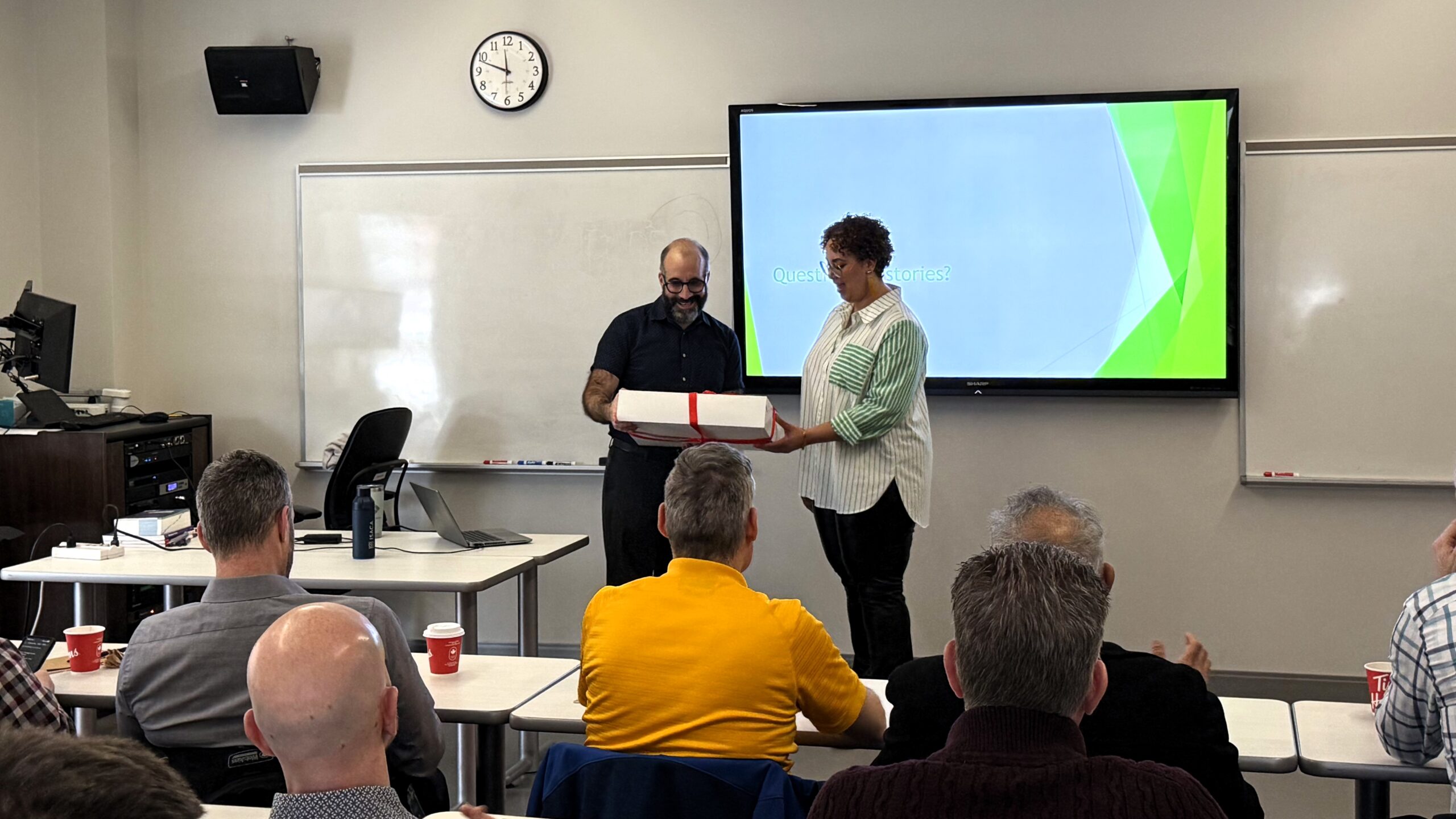Richard accepts a gift of local treats from ICT Research Analyst Aislyn Laurent.